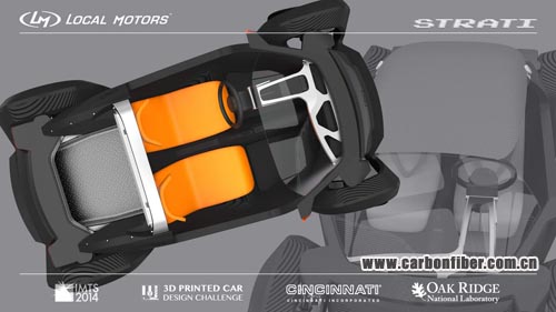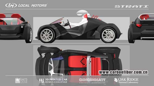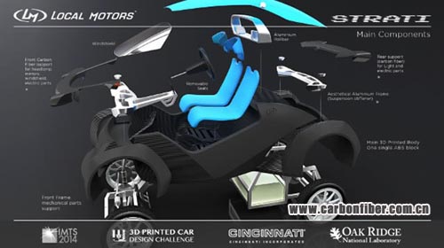 Local Motors方面表示,Strati汽車所用的碳纖維復(fù)合材料由Sabic創(chuàng)新業(yè)務(wù)部獨(dú)家提供。該新型3D打印汽車全身由40個(gè)部件組成。其中,13-20%為碳纖維增強(qiáng)型復(fù)合材料,87-80%為ABS樹脂。