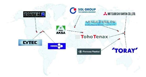 目前,世界碳纖維年產(chǎn)量約50000噸,PAN基碳纖維約占各種碳纖維材料的80%以上,其中日本東麗、東邦和三菱人造絲3家公司占據(jù)了70%以上,其余主要的生產(chǎn)商還有中國臺灣的臺塑公司、美國的Hexcel、Cytec、Zoltek公司,德國的SGL公司以及韓國的泰光產(chǎn)業(yè)公司等。