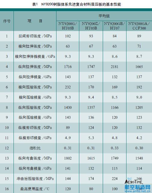 為提高和穩(wěn)定先進(jìn)復(fù)合材料的成型質(zhì)量,降低先進(jìn)復(fù)合材料的制造成本,我們根據(jù)不同的復(fù)合材料結(jié)構(gòu)件研制開發(fā)了中高溫度固化、韌性不同的NY9200環(huán)氧樹脂體系,原材料均為國(guó)產(chǎn),價(jià)廉易購(gòu);其配制工藝簡(jiǎn)單,質(zhì)量穩(wěn)定,可用于濕法或干法預(yù)浸,無(wú)污染,易工程化;其預(yù)浸料具有貯存期長(zhǎng),固化溫度帶寬,固化時(shí)間短等優(yōu)點(diǎn);其先進(jìn)復(fù)合材料具有韌性和機(jī)械性能兼優(yōu)的特性,完全可滿足使用溫度為80~130℃的國(guó)內(nèi)先進(jìn)復(fù)合材料對(duì)樹脂基體的要求。其先進(jìn)復(fù)合材料層壓板的基本性能如表1所示。