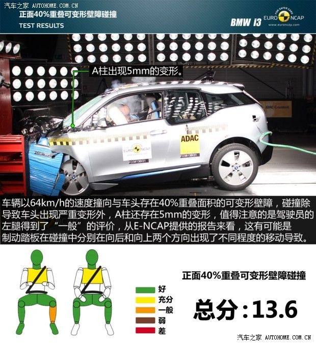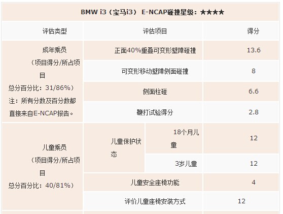 寶馬i3之所只拿到四星的成績,很大程度上都是因為這款車在行人保護和主動安全系統(tǒng)兩項評估失分較多,其中,行人保護測試中針對骨盆的評價和主動安全系統(tǒng)測試中有關(guān)速度輔助系統(tǒng)的評估都沒有得分,這導(dǎo)致兩項測試的得分均只拿到總分的一半。