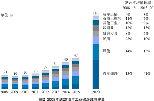 2010年,包括體育休閑和宇航在內(nèi)的工業(yè)應(yīng)用大約消耗了總產(chǎn)量31000t中的20000t,已占到碳纖維消費(fèi)量的2/3(見圖1)。到2015年,體育休閑消費(fèi)量將超過7000t/年,同時(shí)工業(yè)消費(fèi)量應(yīng)從20000t/年增長(zhǎng)到47000t/年,到2020年,甚至達(dá)到110000t/年(見圖2)。從中期看,風(fēng)電葉片可能是碳纖維需求的主要?jiǎng)恿?,而從長(zhǎng)期看,汽車行業(yè)將促進(jìn)碳纖維的需求。僅靠汽車行業(yè)就能改變碳纖維復(fù)合材料生產(chǎn)企業(yè)的面貌。 本文來(lái)自123