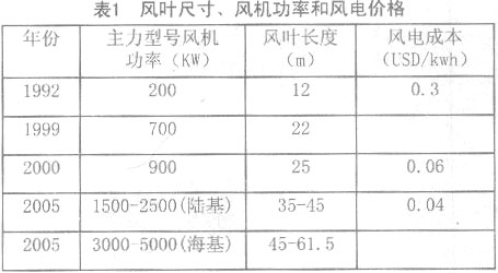 葉片也是風(fēng)機(jī)中成本最高的部件,雖然它的重量不到風(fēng)機(jī)重量的15%。Peter Jamieson認(rèn)為風(fēng)葉成本約占風(fēng)電成本的10%。 風(fēng)葉類似于航空葉片,要求提高提升比(Lift-to-drag ratio),并且其提升特性不易受葉片表面污染和粗糙度影響。從結(jié)構(gòu)考慮要求葉片有較厚的葉型。葉片要經(jīng)受20年應(yīng)用,以受風(fēng)力造成的疲勞次數(shù)達(dá)10(也有以500萬次作標(biāo)準(zhǔn))。隨著風(fēng)機(jī)功率的增加,風(fēng)葉尺寸也相應(yīng)增加。表1所示為不同年份風(fēng)機(jī)功率、風(fēng)葉尺寸和風(fēng)電價格的變化趨勢。