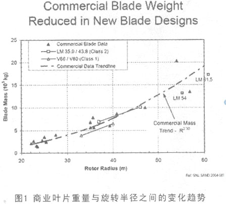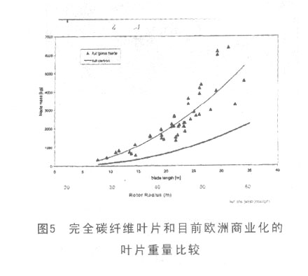 當(dāng)葉片長度增加時,重量的增加要快于能量的提取,因?yàn)橹亓康脑黾雍惋L(fēng)葉長度的立方成正比(圖1),而風(fēng)機(jī)產(chǎn)生的電能和風(fēng)葉長度的平方成正比。同時隨著葉片長度的增加,對增強(qiáng)材料的強(qiáng)度和剛度等性能提出了新的要求,玻璃纖維在大型復(fù)合材料葉片制造中逐漸顯現(xiàn)出性能方面的不足。為了保證在極端風(fēng)載下葉尖不碰塔架,葉片必須具有足夠的剛度。減輕葉片的重量,又要滿足強(qiáng)度與剛度要求,有效的辦法是采用碳纖維增強(qiáng)。國外專家認(rèn)為,由于現(xiàn)有材料性不能很好滿足大功率風(fēng)力發(fā)電裝置的需求,玻璃纖維復(fù)合材料性能已經(jīng)趨于極限,因此,在發(fā)展更大功率風(fēng)力發(fā)電裝置和更長轉(zhuǎn)于葉片時,采用懺能更好的碳纖維復(fù)合材料是勢在必行。根據(jù)國外有關(guān)資料報道,當(dāng)風(fēng)力機(jī)超過3MW、葉片長度超過40米時,在葉片制造時采用碳纖維已成為必要的選擇。事實(shí)上,當(dāng)葉片超過一定尺寸后,碳纖維葉片反而比玻纖葉片便宜,因?yàn)椴牧嫌昧?、勞動力、運(yùn)輸和安裝成本等都下降了。