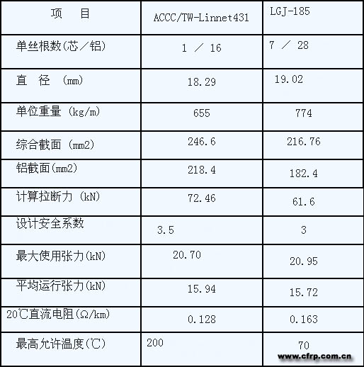 碳纖維復合芯導線的鋁面積218平方米,大于原LGJ-185導線182.4平方米的鋁面積,載流能力大大增加。下表反映了本次選定的碳纖維復合芯導線與原導線參數(shù)的對比情況。