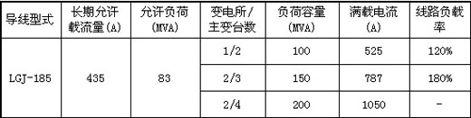 原LGJ-185導線只能滿足帶一個變電所2臺主變的要求,遇故障或檢修,帶3臺50MVA主變,需輸送787A,LGJ-185導線就已不能承擔。導線輸送容量的限制給電網(wǎng)運行方式的靈活調(diào)整帶來困難。