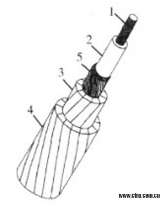 圖2:1、碳纖維環(huán)氧樹(shù)脂復(fù)合材料內(nèi)芯;2、玻璃纖維增強(qiáng)環(huán)氧樹(shù)脂復(fù)合材料外芯;3、第一層梯形鋁導(dǎo)線;4、第二層梯形鋁導(dǎo)線;5、保護(hù)性涂層。 123456