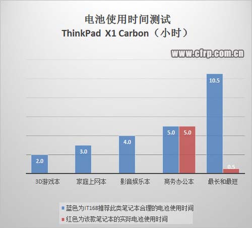 對于超極本來說,英特爾要求所有的超超極本在MobileMark2007電池使用時間測試中必須超過5小時,而ThinkPad X1 Carbon在屏幕亮度調(diào)整到50%以后,在該項測試中運行了301分鐘(5小時1分鐘),達到英特爾的要求,基本滿足日常應用的需求。
