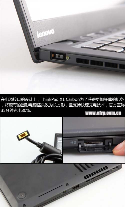 在電源接口的設(shè)計上,ThinkPad X1 Carbon為了獲得更加纖薄的機身,將原有的圓形電源插頭改為長方形,且支持快速充電技術(shù),官方宣稱35分鐘充電80%。