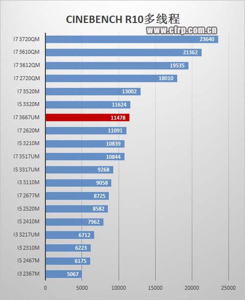 ThinkPad X1 Carbon搭載的第三代酷睿i7 3667UM低功耗處理器是目前主流超極本中定位較高的一款,它擁有兩個物理核心,支持英特爾超線程技術(shù)和睿頻2.0。在CINEBENCH R10處理器多線程測試中,i7 3667UM取得了11478分,其性能已超過上一代標準電壓雙核i7處理器,與新一代酷睿i5 3320性能表現(xiàn)相近,滿足日常應用對CPU性能的需求。