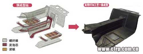 最初的設計將地板分為6個部件,后來采用RTM工藝統(tǒng)合成了一個部件。不僅減少了模具,還將工時縮短了80%,與粘合組裝相關的機械加工減少了50%。成型時結合使用了RTM工藝與注入壓縮工藝。