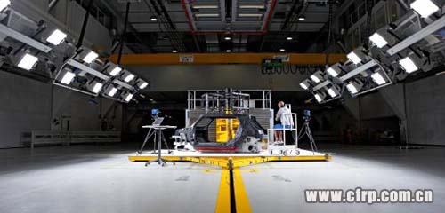 駕駛室是在采用各種方法成型的部件上涂粘合劑,放在夾具上,在爐內固化60分鐘使其合為一體。外板方面,采用RTM工藝制成了前部發(fā)動機罩,采用VaRTM工藝制成了CFRP車頂。