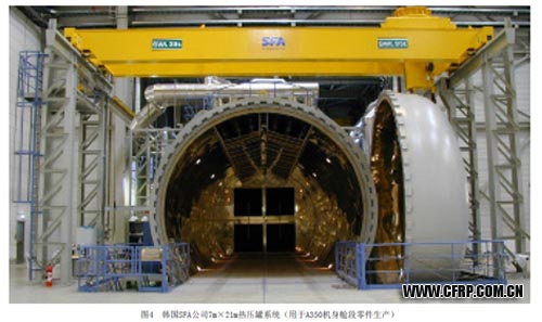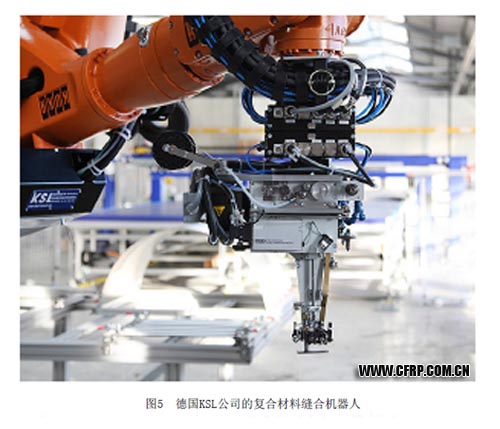 除自動(dòng)鋪絲/鋪帶機(jī)外,其他一些先進(jìn)的復(fù)合材料自動(dòng)化加工設(shè)備也廣泛應(yīng)用于波音和空客等主要飛機(jī)制造廠商的最新型號(hào)生產(chǎn)中。在復(fù)合材料固化方面,承接空客A350機(jī)身零件生產(chǎn)任務(wù)的德國Premium Aerotech公司采購兩臺(tái)韓國SFA公司(原英國Aeroform)公司制造的工作直徑為7m,工作長度為21m的巨型軸流式熱壓罐用于A350前機(jī)身13~14號(hào)艙段和后機(jī)身16~18號(hào)艙段的生產(chǎn)(圖4),由于采用沿?zé)釅汗揲L度方向排布的自動(dòng)控制加熱功率的加熱元件和先進(jìn)的基于“動(dòng)態(tài)熱位差”控制原理的自動(dòng)控制軟件,罐內(nèi)溫度均勻性和生產(chǎn)效率都得到提高,從而最大限度地保證了A350項(xiàng)目的流暢性。模壓成形方面,波音787的翼梁生產(chǎn)中使用了西班牙SENER公司的裝備自動(dòng)裝卸模具裝置的熱隔膜成形機(jī)生產(chǎn)C形梁,并使用同一家公司生產(chǎn)的復(fù)合材料自動(dòng)拉擠成形機(jī)生產(chǎn)用于填補(bǔ)兩C形梁之間三角區(qū)的材料。在復(fù)合材料縫合和編織方面,空客A380巨型客機(jī)的后機(jī)身承壓隔框的生產(chǎn)中,德國KSL公司提供的自動(dòng)縫合機(jī)器人將多層多軸向碳布進(jìn)行縫合(圖5)[3],以保證各層碳布之間的連接,然后利用先進(jìn)RFI(樹脂膜熔塑)技術(shù)進(jìn)行樹脂浸潤、固化并得到零件[4]。
