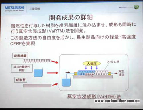 三菱電機(jī)采用的是稱為真空輔助樹脂轉(zhuǎn)移成型(VaRTM)法的工藝:將置于模具上的碳纖維用薄膜材料密封起來(lái),邊向模具和薄膜材料之間注入樹脂邊減壓,使其在大氣壓下成型。樹脂采用了通用的阻燃性乙烯酯。雖然VaRTM法早已是廣為人知,但樹脂的流動(dòng)及纖維配向控制,以及在碳纖維中夾入隔熱材料等其他材料等的“生產(chǎn)技術(shù)的提高,才使得其能適用于消費(fèi)類產(chǎn)品”。該公司已將CFRP應(yīng)用于人造衛(wèi)星,但人造衛(wèi)星用CFRP需要用熱壓罐對(duì)預(yù)浸料進(jìn)行加熱加壓等,存在預(yù)浸料及熱壓罐設(shè)備導(dǎo)致成本上升的難題。