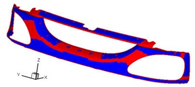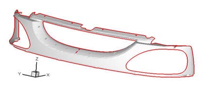由于SMC在模腔中流動過程是一個非線性的多場耦合問題,一方面模壓料在模壓過程中變形相當(dāng)大;另一方面模壓料的粘度隨應(yīng)變速率、溫度和樹脂固化度的可變性,使得其本構(gòu)關(guān)系是非線性的。因此擬采用分步計算的方法,通過控制體有限元法來描述模壓料的流動狀況,而模壓過程中的樹脂流動問題是一個具有運動邊界的非穩(wěn)態(tài)過程。為了解決這一問題,我們將模壓過程作為一系列準(zhǔn)穩(wěn)態(tài)的瞬間解的組合。在每一時間步,當(dāng)壓力場確定后,速度場可通過動量方程計算得到,新的流動前鋒的位置可由流動前鋒的速度分量和時間增量來估算。與壓力場的求解相類似,溫度場和轉(zhuǎn)化率可根據(jù)當(dāng)前的速度場來確定。由計算所得的溫度和轉(zhuǎn)化率則用于更新粘度,新的粘度值重新用于計算壓力場,溫度場和轉(zhuǎn)化率計算,重復(fù)這一過程直至整個模腔充滿,以汽車面罩產(chǎn)品為例: