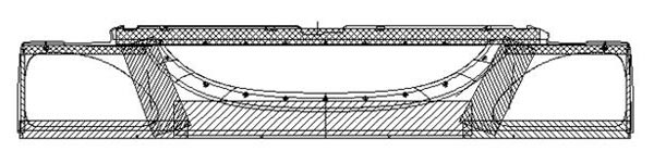 通過引入計算機模擬這一過程將使材料的流動方向和流動時間可視化,從而指導(dǎo)鋪層設(shè)計,確定前期對產(chǎn)品的工藝設(shè)計的方向,其基本的原理為:設(shè)SMC模壓流動時為不可壓縮的流體,結(jié)合動量、能量、質(zhì)量守恒方程,得到SMC模壓流動的控制方程。其控制方程包括壓力分布方程、熱傳導(dǎo)方程和固化反應(yīng)動力學(xué)方程等。對于薄殼件流動,如果假設(shè)模具表面沒有滑移;流動中的主應(yīng)力是剪應(yīng)力。