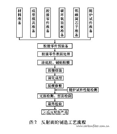 c波段天線(xiàn)主要由天線(xiàn)反射面及其它支撐結(jié)構(gòu)組成。本文著重介紹其反射面型面精度和尺寸穩(wěn)定性控制,根據(jù)我單位承擔(dān)某型號(hào)任務(wù)要求,其天線(xiàn)反射面的制造工藝流程,見(jiàn)圖2。