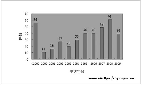我國2009年以前公開的碳纖維生產領域的專利申請數量如圖1所示。