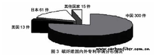 就技術而言,國外碳纖維的生產技術要遠遠領先于國內,然而令人驚訝的是,如圖3所示,在389件碳纖維專利申請中,竟然有高達300件為國內申請人提出,占申請量的77%,僅89件為外國申請人提出,而在這89件中又以日本和美國占據大多數。筆者認為,這一現象的出現與國外企業(yè)對于技術的嚴格保密有很大關系。我國專利法要求專利申請充分公開,以所屬技術領域的技術人員能夠實現為準,外國企業(yè)可能擔心過多的國內申請會導致關鍵技術的外泄,因此,對于在華申請有所保留,這也提醒了國內研究者需更多關注國外該領域相關報道,同時加強自主研發(fā)。