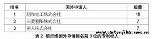 與之相反的是,國外申請人中位于前三位的均為日本企業(yè),大型纖維、化工企業(yè)是碳纖維研究進展的主導力量。目前,在碳纖維領域,日本企業(yè)占有市場份額最大,關鍵技術主要掌握在東麗公司、東邦Tenax集團和三菱人造絲集團手中,其他碳纖維企業(yè)多處于成長階段,生產工藝正在摸索中不斷完善。從專利申請數量上看,以昭和電工株式會社最多(Showa Denko)(見表2)。