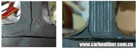 在整體化結(jié)構(gòu)接頭內(nèi)部,由于載荷傳遞路徑的特殊性,有可能形成不容忽視的層間應(yīng)力區(qū)(包括層間正應(yīng)力和層間剪切應(yīng)力)。該區(qū)層間應(yīng)力在量值上可能小于結(jié)構(gòu)承受的面內(nèi)應(yīng)力,但由于復(fù)合材料對層間應(yīng)力的敏感性,破壞則往往由此開始產(chǎn)生(圖2)。層間應(yīng)力導(dǎo)致的破壞模式是整體化結(jié)構(gòu)接頭的一個(gè)重要力學(xué)行為特點(diǎn)。有關(guān)接頭承載能力的評估需給予特殊關(guān)注。