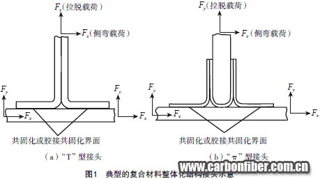 復(fù)合材料結(jié)構(gòu)件中,不同結(jié)構(gòu)組分可通過共固化或膠接共固化途徑結(jié)為一體,以取代緊固件連接方式。此狀態(tài)下,在共固化或膠接共固化界面周邊,形成一個(gè)特殊的接頭區(qū)。所謂復(fù)合材料整體化結(jié)構(gòu),即為內(nèi)含此類接頭的復(fù)合材料結(jié)構(gòu)型式,圖1給出了典型接頭及其載荷示意。