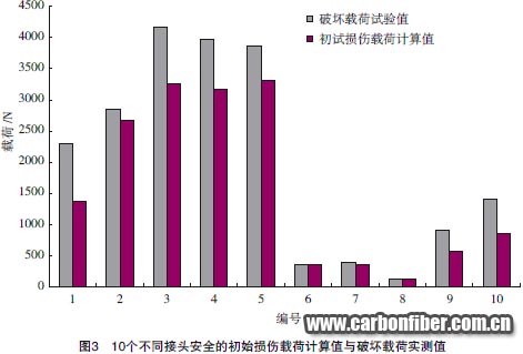 以初始損傷載荷還是破壞載荷來表征接頭的承載能力,也是接頭力學(xué)行為模擬涉及的一個(gè)具體問題。對破壞載荷的預(yù)測不存在特殊的技術(shù)困難。實(shí)際上,描述復(fù)合材料破壞過程的各種算法模型在許多工作中得到應(yīng)用。但時(shí)間耗費(fèi)是破壞載荷計(jì)算的一個(gè)主要問題。當(dāng)分析目標(biāo)是一個(gè)給定的結(jié)構(gòu)案例時(shí),計(jì)算時(shí)間的影響作用并不凸現(xiàn)。但當(dāng)分析目標(biāo)是結(jié)構(gòu)參數(shù)變化的影響作用評估或結(jié)構(gòu)方案的優(yōu)化時(shí),由于涉及大量案例的反復(fù)計(jì)算,采用破壞載荷作為承載能力表征會(huì)使計(jì)算時(shí)間的耗費(fèi)變得難以接受。在這種情況下,建議采用初始損傷載荷作為目標(biāo)函數(shù)。初始損傷載荷和破壞載荷分別處于破壞過程兩端,一般情況下兩者之間會(huì)存在差異,差異的幅度也隨結(jié)構(gòu)參數(shù)和載荷條件的不同而變化。但就結(jié)構(gòu)方案的比較而言,初始損傷載荷的計(jì)算值可以切實(shí)反映承載能力的優(yōu)劣狀況。圖3給出一系列不同形式、不同參數(shù)、不同載荷形式的接頭案例,由試驗(yàn)測得的破壞載荷與通過計(jì)算得到的初始損傷載荷。從圖3可見,在案例承載能力的橫向比較上,初始損傷載荷計(jì)算值和破壞載荷實(shí)測值反映了基本一致的優(yōu)劣態(tài)勢。