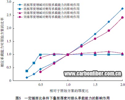 圖5為一原始接頭方案,在給定鋪層比條件下增減其填充區(qū)周邊突緣疊層厚度或底板疊層厚度,承載能力所受影響作用的模擬結(jié)果??梢钥吹?,接頭結(jié)構(gòu)參數(shù)在一定范圍內(nèi)變化可對承載能力形成顯著影響,并且影響作用會(huì)隨載荷形式的不同而發(fā)生明顯差異。由于本文的綜述性質(zhì),此處不對影響作用的具體細(xì)節(jié)進(jìn)行討論,僅通過圖例表明其復(fù)雜性。同時(shí)表明,對于接頭的合理設(shè)計(jì),模擬結(jié)果可提供方向性的參數(shù)修正依據(jù)。