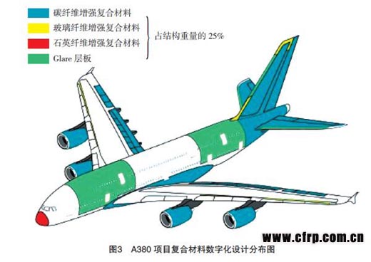 空客公司在整個A350 XWB項目、A380復合材料項目中完成了對所有復合材料零件的CATIA平臺設(shè)計,并使用復合材料設(shè)計模塊完成數(shù)字化的設(shè)計制造任務。以空客A380(圖3)為例:其復合材料用量占到結(jié)構(gòu)重量的25%,機身段、尾翼段、襟副翼的設(shè)計制造都是采用CPD模塊對設(shè)計制造流程進行優(yōu)化??湛凸镜墓こ處熡肅ATIA定義模具面、層的位置和邊界、泡沫夾芯的位置等。CPD軟件將層管理起來,為每個層自動生成表格,記錄非幾何信息與層的邊界、相關(guān)的標記等聯(lián)系起來,確保層在制造過程中能正確定位。CPD的文檔功能,生成鋪層圖、鋪層表、材料表和序列表,從而使空客的復合材料設(shè)計工作時間降低了約50%,采用了新技術(shù)和軟件設(shè)計制造復合材料部件后,空客公司節(jié)省了5%~25%的初始設(shè)計時間,減少了45%的反復設(shè)計修改時間,極大地降低了手工鋪層的時間,達到了全過程控制復合材料鋪層,消除了反復試驗的過程,提高產(chǎn)品質(zhì)量的同時最大限度地降低了產(chǎn)品的廢品率。