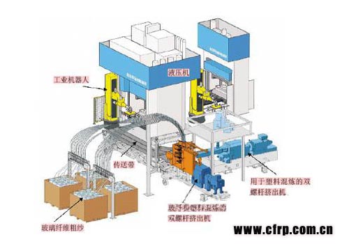 在這種工藝方案中,第一臺(tái)雙螺桿擠出機(jī)將塑料粒料和添加劑熔融混合,并擠出到第二臺(tái)雙螺桿擠出機(jī)中。第二臺(tái)擠出機(jī)將玻纖切斷,并與塑料熔體混合均勻,擠成約200~300mm寬的條形料。條形料通過(guò)帶有加熱功能的傳送帶向前輸送,并由工業(yè)機(jī)器人抓取后送至模具中進(jìn)行模壓成型。