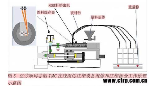 克勞斯瑪菲公司開(kāi)發(fā)的在線配混注塑成型設(shè)備(其工作原理如圖3所示)為L(zhǎng)FT工藝的實(shí)現(xiàn)提供了一種新的方法。該設(shè)備將雙螺桿混煉機(jī)和克勞斯瑪菲的標(biāo)準(zhǔn)MC塑料注塑機(jī)組合,實(shí)現(xiàn)了原料在線直接混煉。這種混煉-注塑方法具有更多優(yōu)勢(shì):