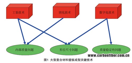 整體成型的大型復(fù)合材料壁板制件,針對(duì)其結(jié)構(gòu)特點(diǎn)以及存在的主要問題,其成型的關(guān)鍵技術(shù)主要有3個(gè)方面:工裝技術(shù)、固化成型技術(shù)、數(shù)字化技術(shù),如圖1所示。