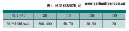加壓點(diǎn)包括加壓溫度、加壓時(shí)機(jī)。加壓點(diǎn)的選擇, 首先是加壓溫度,加壓溫度過低則樹脂流動(dòng)性不好,纖維不易均勻浸潤易造成缺陷;加壓溫度過高,樹脂聚合速率過快不易掌握加壓時(shí)機(jī)。其次在確定加壓溫度的前提下把握好加壓時(shí)機(jī),加壓時(shí)機(jī)過早則樹脂粘度低,排出樹脂過多造成零件貧膠、孔隙率高;加壓時(shí)機(jī)過晚則樹脂聚合程度高,流動(dòng)性差制件易夾雜氣泡產(chǎn)生疏松、分層等缺陷。加壓點(diǎn)的最佳選擇為樹脂由粘流態(tài)向高彈態(tài)轉(zhuǎn)變過程中的過渡區(qū)間。這和升溫速率、加壓溫度、加壓時(shí)機(jī)都密切相關(guān),不同的溫度—時(shí)間曲線有著不同的加壓點(diǎn)。目前經(jīng)常采用差熱分析儀和流變儀來了解樹脂的固化反應(yīng)過程和粘度變化過程,實(shí)際生產(chǎn)中也有用滑板法或拉絲法測(cè)定凝膠時(shí)間來了解樹脂在溫度—時(shí)間曲線各個(gè)點(diǎn)的粘度情況,如表4、表5所示。