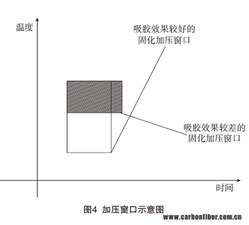 經(jīng)過試驗(yàn)和工藝驗(yàn)證,應(yīng)該轉(zhuǎn)變我們的工藝觀點(diǎn),應(yīng)注重預(yù)成型工藝和吸膠效果。如果吸膠效果不好其坯料中的揮發(fā)份、氣體就不能有效排除,那么在固化過程中隱患比較大,固化工藝的選擇尤為嚴(yán)格,某種意義上講其加壓窗口范圍更小。而反之若預(yù)成型工藝效果理想,坯料中的揮發(fā)份、氣體有效排除,結(jié)構(gòu)密實(shí),那么固化過程中出現(xiàn)問題的機(jī)率較小,固化工藝相對(duì)比較好控制,對(duì)加壓時(shí)機(jī)不那么敏感,尤其是提早加壓對(duì)零件固化質(zhì)量影響不大,一定程度上反而是拓寬了加壓窗口,如圖4所示。