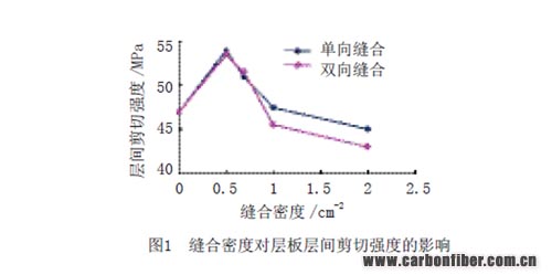 縫合密度對縫合復合材料層間性能影響很大,沖擊試驗研究表明縫合密度增大,復合材料分層損傷面積減小,密度增大4倍,分層減少40%[15]。但縫合的同時,縫針、線對層合板的纖維造成一定程度的損傷(纖維斷裂或纖維彎曲),層板面內(nèi)性能下降[16]。縫合密度越大,纖維損傷程度越嚴重,適當?shù)目p合密度才能使縫合達到最佳狀態(tài)。圖1~3分別給出了縫合密度與縫合復合材料的層間剪切強度、壓縮強度及層間斷裂韌性GIC的關(guān)系曲線[15-17]。