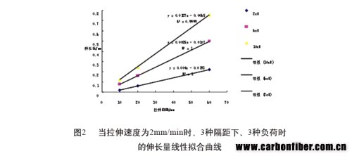 從圖2可以看出,在拉伸速度為2mm/min下,拉伸負(fù)荷分別達(dá)到2cN、6cN、10cN時,拉伸隔距和測試結(jié)果的伸長量為線性關(guān)系。