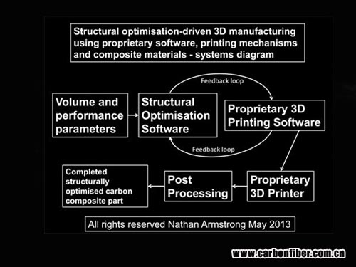 據(jù)Armstrong介紹,他正開發(fā)的技術(shù)采用一種專有工藝,這種工藝采用6軸3D打印機(jī)可以以任意角度打印,并使用最適合這種機(jī)器的熱塑性增強(qiáng)碳纖維長(zhǎng)絲,制造最終的連續(xù)纖維結(jié)構(gòu)體。該系統(tǒng)還可以將多個(gè)零件聯(lián)接成一個(gè)更復(fù)雜的部件。此外,額外的打印頭可以同時(shí)進(jìn)行拼接和纖維編織。